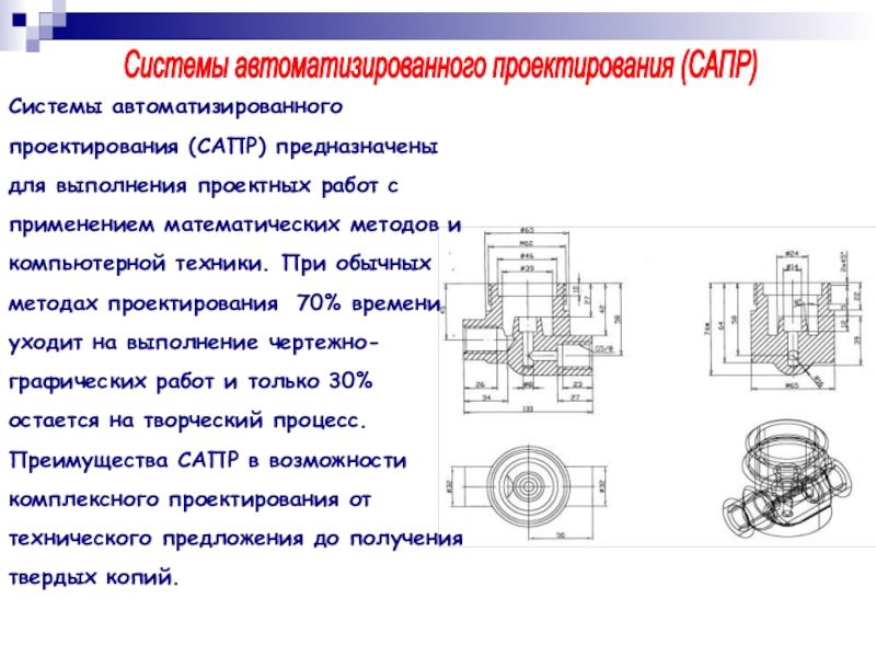 проектных работ с применением математических методов и компьютерной техники. При обычных методах проектирования 70% времени уходит на выполнение чертежно-графических работ и только 30% остается на творческий процесс. Преимущества САПР в возможности комплексного проектирования от технического предложения до получения твердых копий.