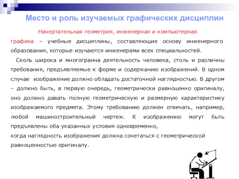 Сколь широка и многогранна деятельность человека, столь и различны требования, предъявляемые к форме и содержанию изображений. В одном случае изображение должно обладать достаточной наглядностью. В другом – должно быть, в первую очередь, геометрически равноценно оригиналу, оно должно давать полную геометрическую и размерную характеристику изображаемого предмета. Этому требованию должен отвечать, например, любой машиностроительный чертеж. К изображению могут быть предъявлены оба указанных условия одновременно,