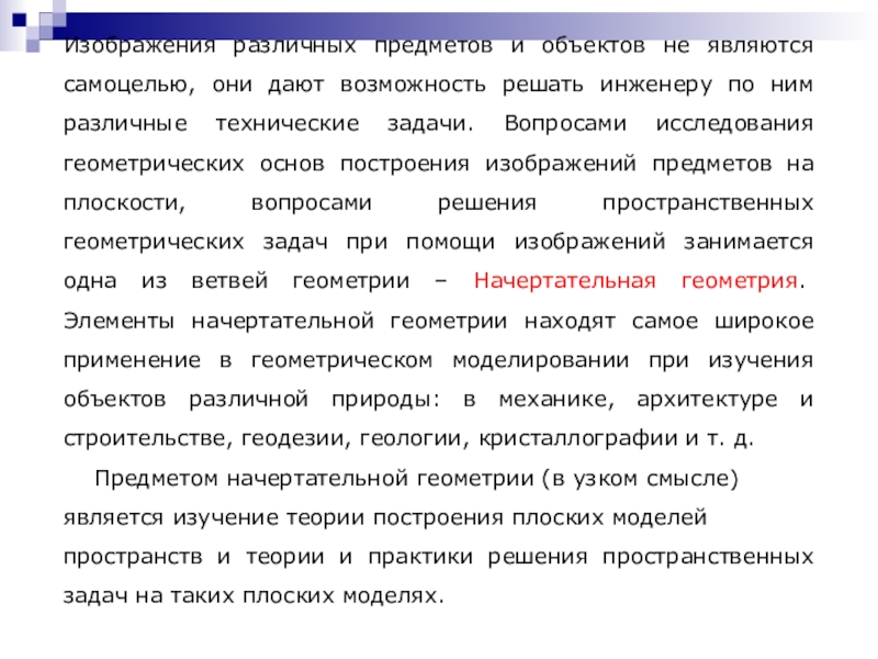 решать инженеру по ним различные технические задачи. Вопросами исследования геометрических основ построения изображений предметов на плоскости, вопросами решения пространственных геометрических задач при помощи изображений занимается одна из ветвей геометрии – Начертательная геометрия. Элементы начертательной геометрии находят самое широкое применение в геометрическом моделировании при изучения объектов различной природы: в механике, архитектуре и строительстве, геодезии, геологии, кристаллографии и т. д.