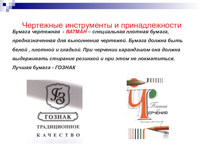 предназначенная для выполнения чертежей. Бумага должна быть белой , плотной и гладкой. При черчении карандашом она должна выдерживать стирание резинкой и при этом не лохматиться. Лучшая бумага - ГОЗНАК