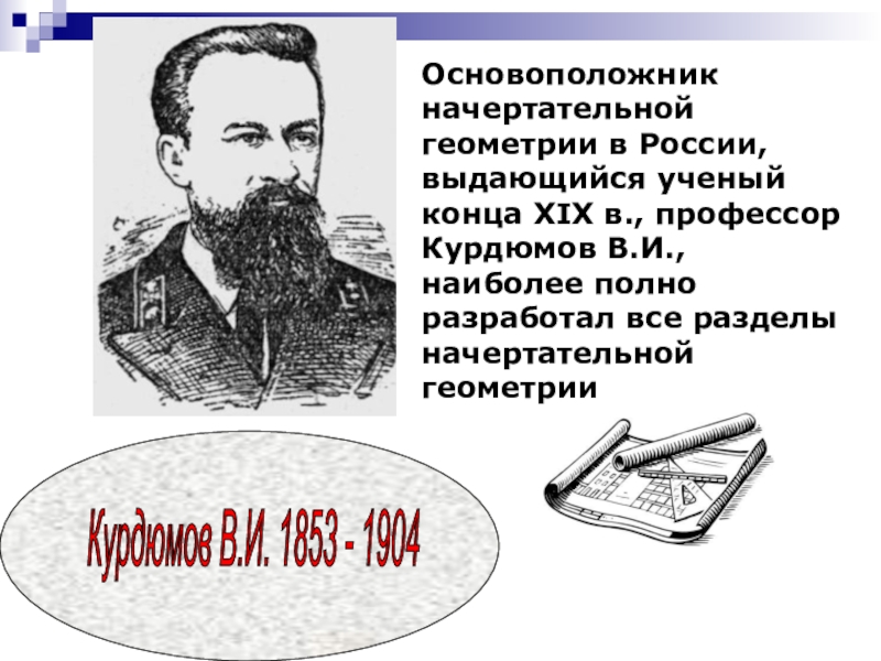ученый конца XIX в., профессор Курдюмов В.И., наиболее полно разработал все разделы начертательной геометрии