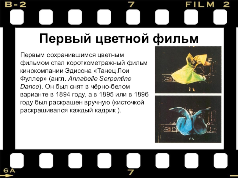 Эдисона «Танец Лои Фуллер» (англ. Annabelle Serpentine Dance). Он был снят в чёрно-белом варианте в 1894 году, а в 1895 или в 1896 году был раскрашен вручную (кисточкой раскрашивался каждый кадрик ).