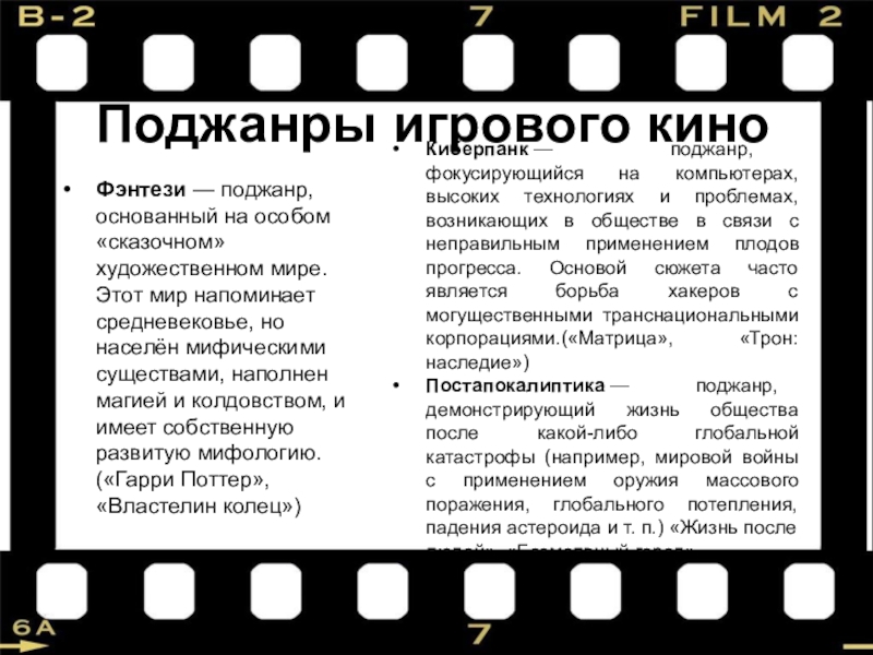 Киберпанк — поджанр, фокусирующийся на компьютерах, высоких технологиях и проблемах, возникающих в обществе в связи с неправильным применением плодов прогресса. Основой сюжета часто является борьба хакеров с могущественными транснациональными корпорациями.(«Матрица», «Трон: наследие»)