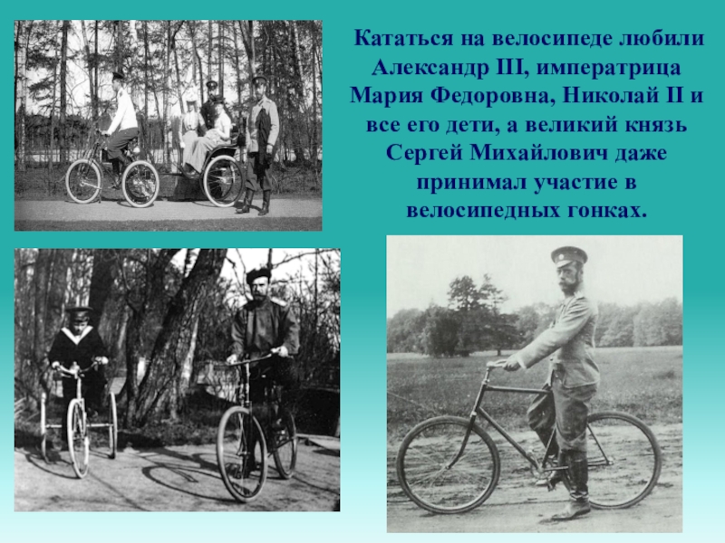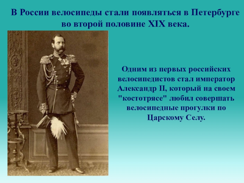 Одним из первых российских велосипедистов стал император Александр II, который на своем "костотрясе" любил совершать велосипедные прогулки по Царскому Селу.