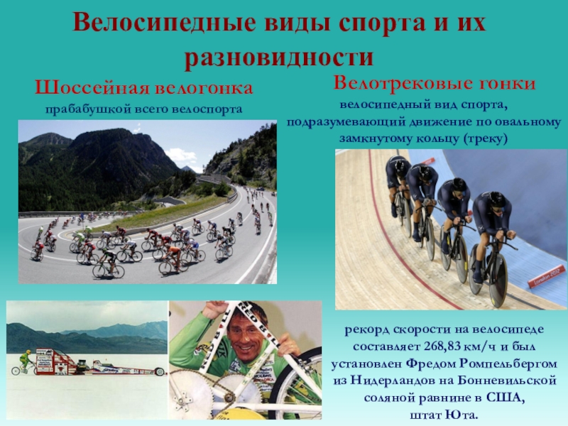 рекорд скорости на велосипеде составляет 268,83 км/ч и был установлен Фредом Ромпельбергом из Нидерландов на Бонневильской соляной равнине в США,