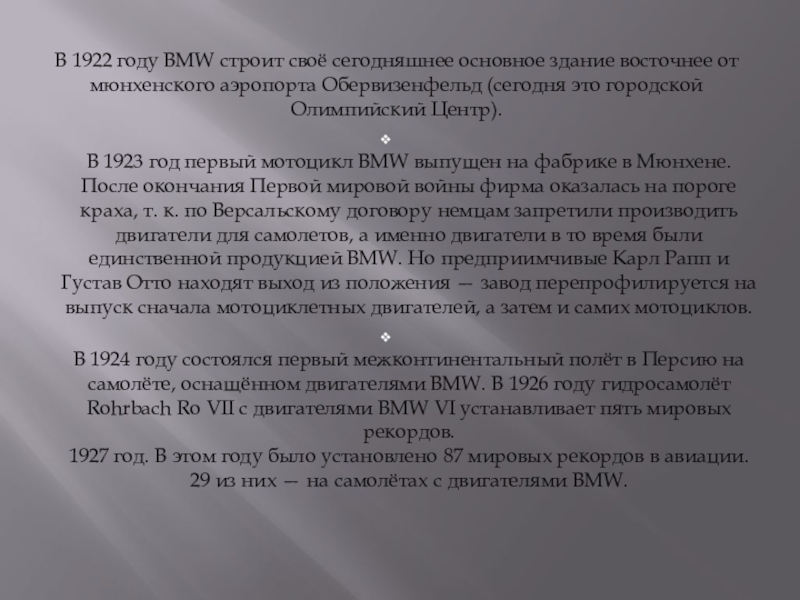 В 1923 год первый мотоцикл BMW выпущен на фабрике в Мюнхене.После окончания Первой мировой войны фирма оказалась на пороге краха, т. к. по Версальскому договору немцам запретили производить двигатели для самолетов, а именно двигатели в то время были единственной продукцией BMW. Но предприимчивые Карл Рапп и Густав Отто находят выход из положения — завод перепрофилируется на выпуск сначала мотоциклетных двигателей, а затем и самих мотоциклов.