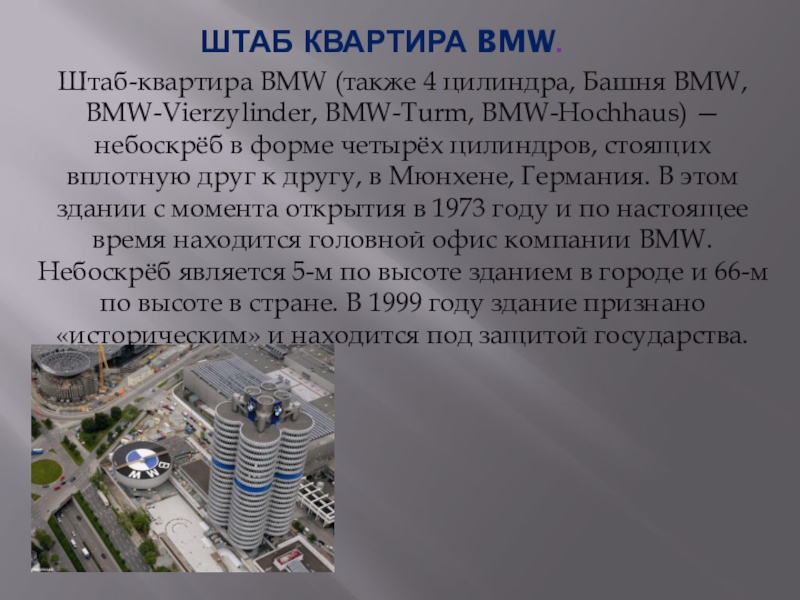 Слайд 1история возникновения бренда BMW. История логотипа.