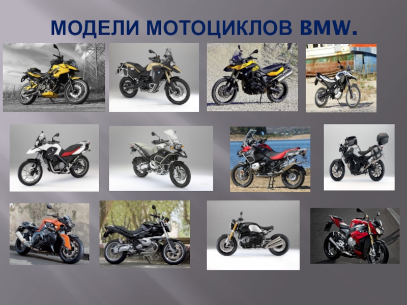 BMW (аббревиатура от Bayerische Motoren Werke AG, «Баварские моторные заводы») — немецкий производитель автомобилей, мотоциклов, двигателей, а также велосипедов. Председателем компании на сегодняшний день является Норберт Райтхофер, а главным дизайнером — Карим Хабиб. Девиз компании на английском языке — «The Ultimate Driving Machine» и «Sheer Driving Pleasure». На русском языке — «С удовольствием за рулем».Компания была создана в 1916 году в Мюнхене при слиянии двух небольших предприятий — Rapp-Flugmotoren Werke и Otto-Werke, которые производили двигатели для авиации.