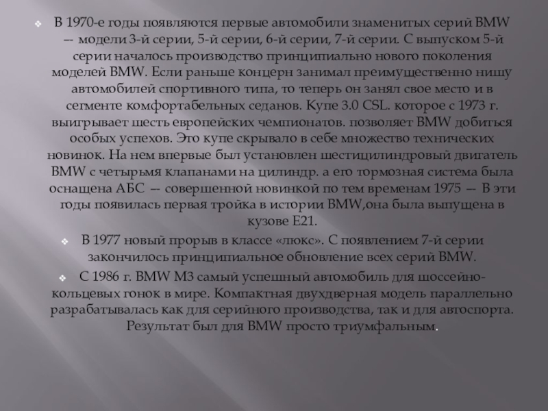 Слайд 14В 1970-е годы появляются первые автомобили знаменитых серий BMW — модели