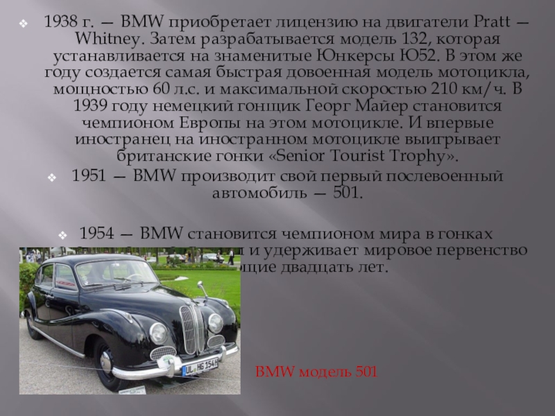 Слайд 91938 г. — BMW приобретает лицензию на двигатели Pratt — Whitney.