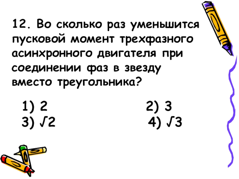 12. Во сколько раз уменьшится пусковой момент трехфазного асинхронного двигателя при соединении фаз в звезду вместо треугольника?