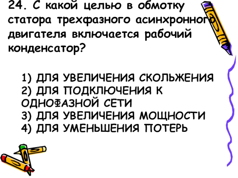 24. С какой целью в обмотку статора трехфазного асинхронного двигателя включается рабочий конденсатор?