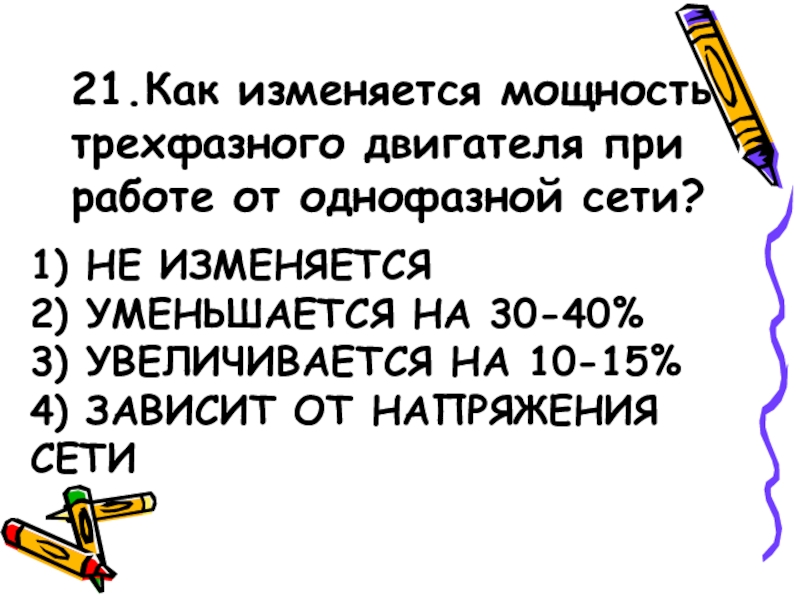 21.Как изменяется мощность трехфазного двигателя при работе от однофазной сети?