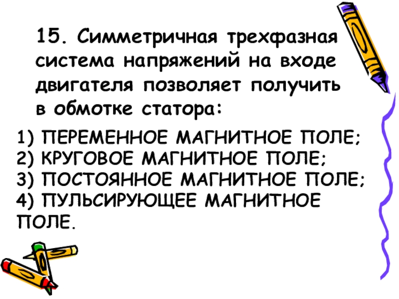 15. Симметричная трехфазная система напряжений на входе двигателя позволяет получить в обмотке статора: