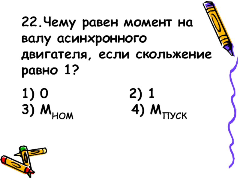 22.Чему равен момент на валу асинхронного двигателя, если скольжение равно 1?
