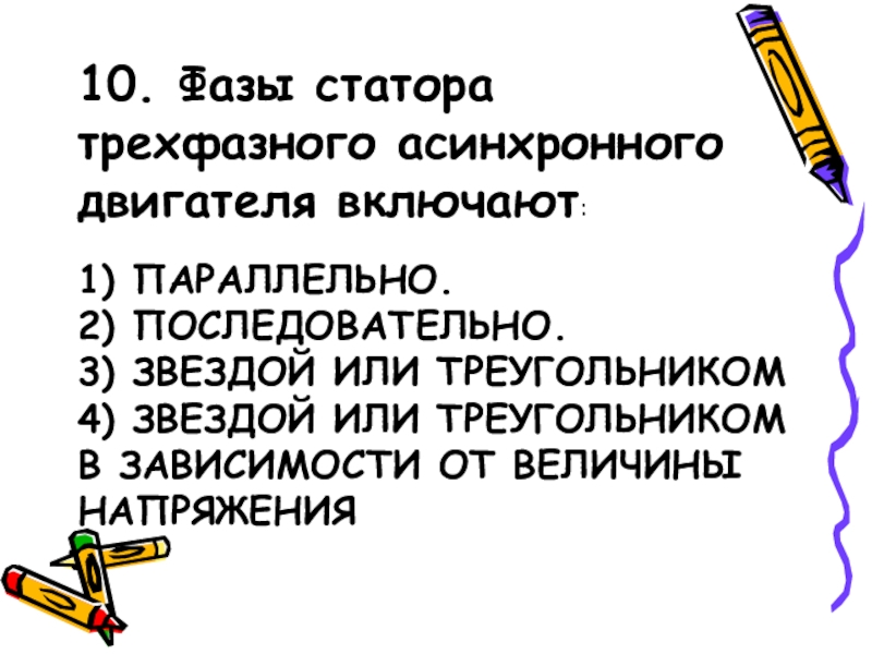 10. Фазы статора трехфазного асинхронного двигателя включают: