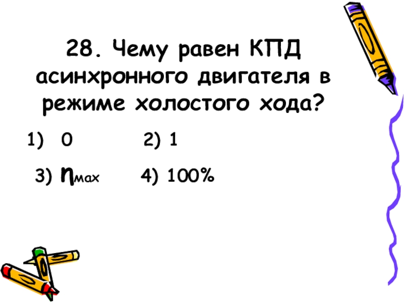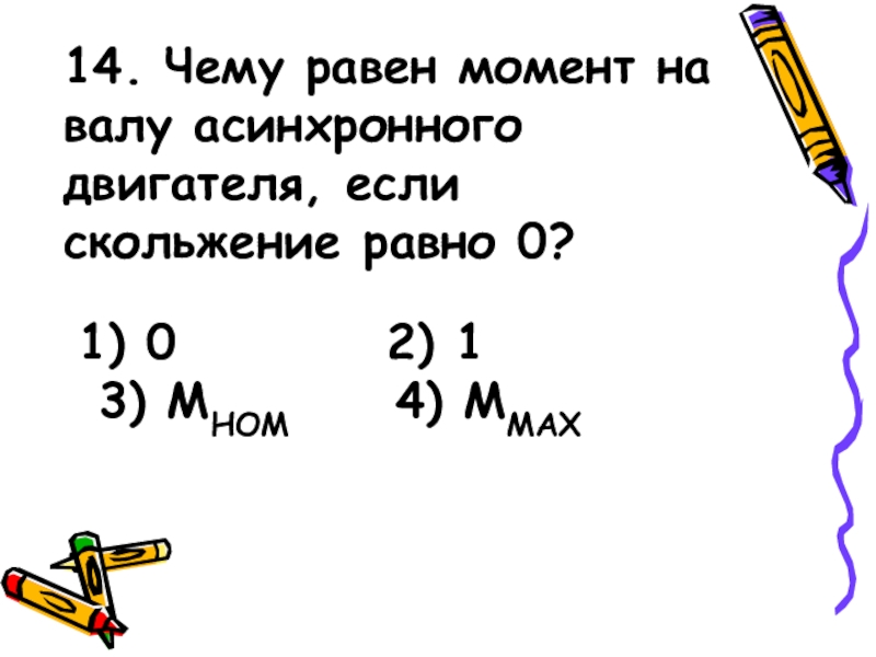 14. Чему равен момент на валу асинхронного двигателя, если скольжение равно 0?