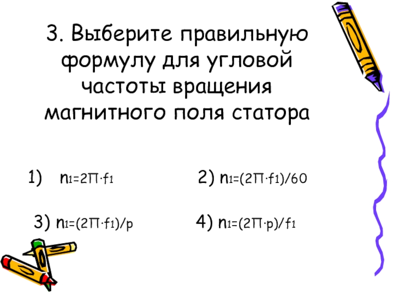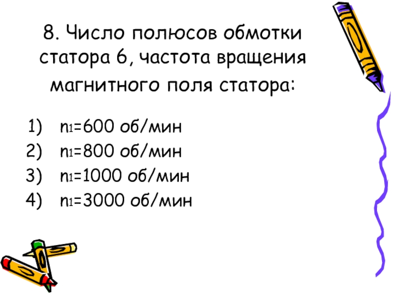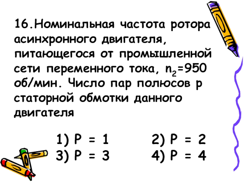 16.Номинальная частота ротора асинхронного двигателя, питающегося от промышленной сети переменного тока, n2=950 об/мин. Число пар полюсов p статорной обмотки данного двигателя