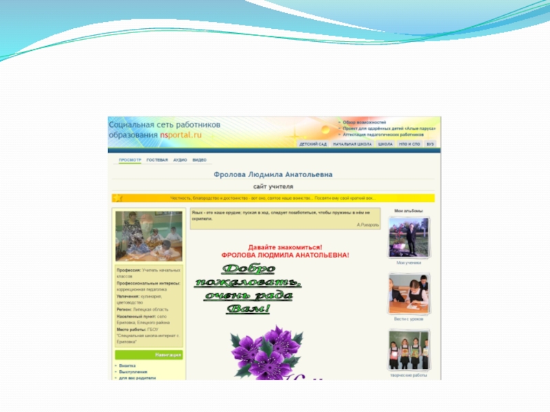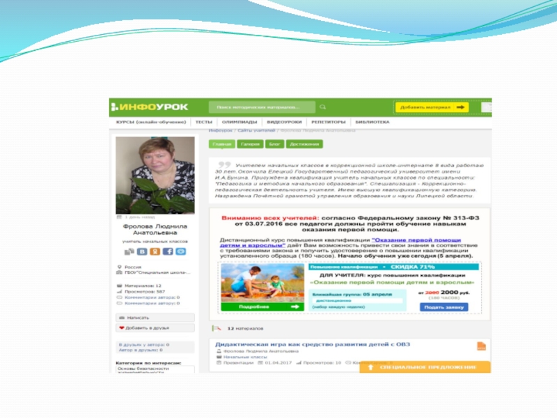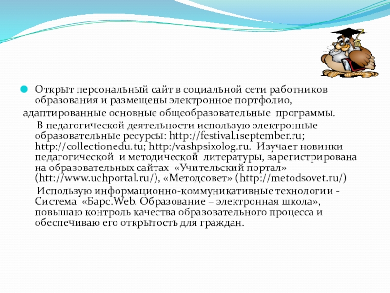 Открыт персональный сайт в социальной сети работников образования и размещены электронное портфолио, адаптированные основные общеобразовательные программы.