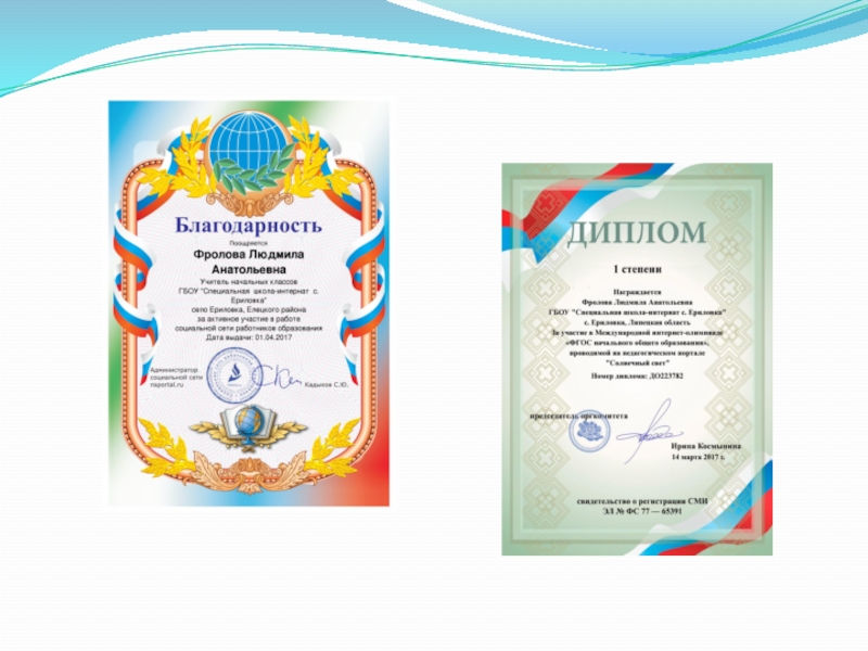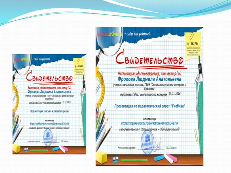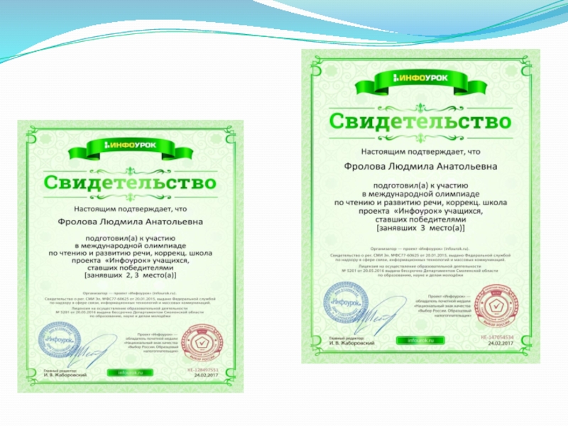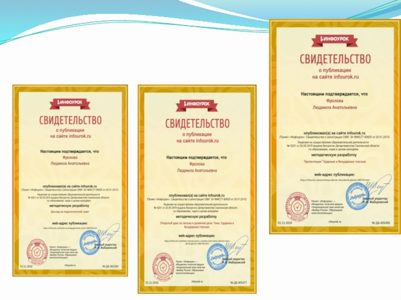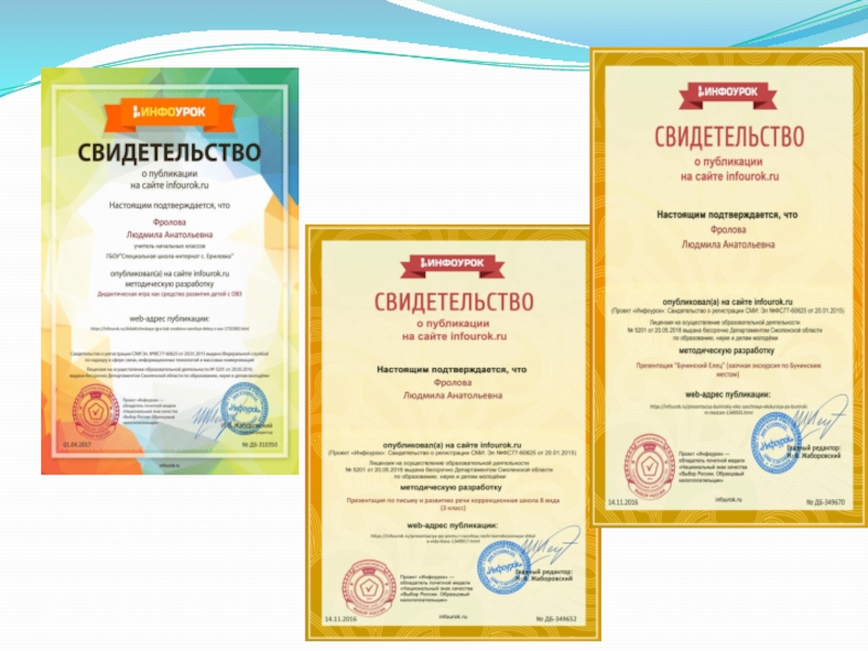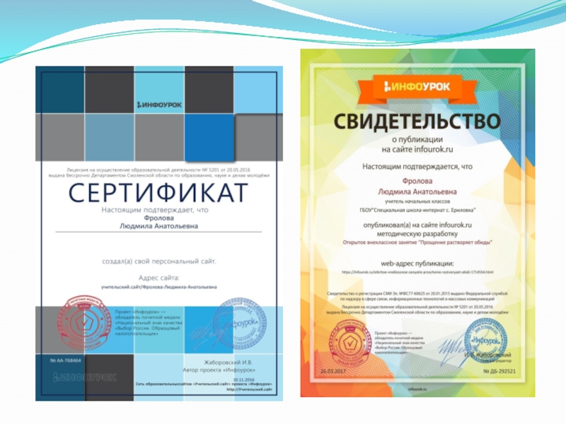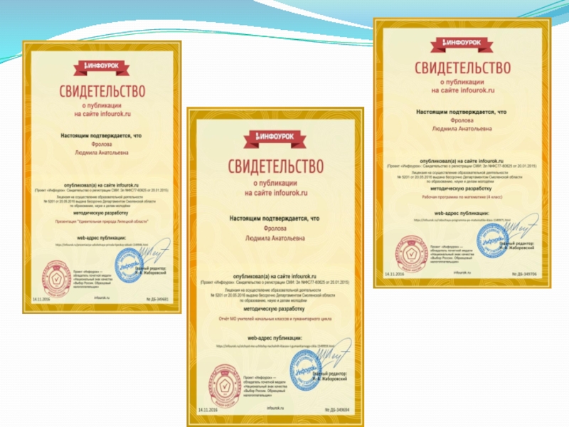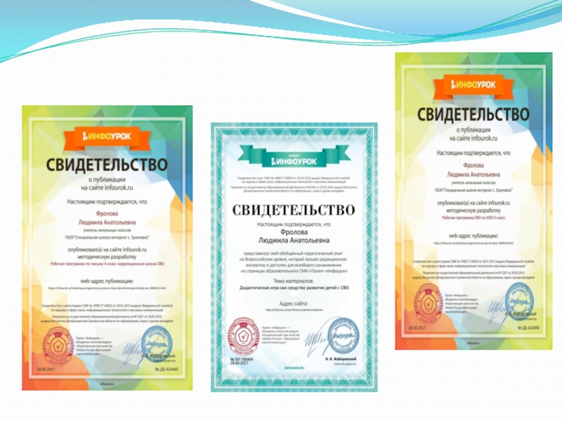 «Инфоурок» - Принимала участие в вебинарах «Девиантное поведение учащихся: причины, признаки, организация работы по его профилактике» -20.10.2016г.; вебинар «Обучение детей с особыми образовательными потребностями» - 2016г.; вебинар «Проектная технология – дополнительный ресурс реализации системно - деятельностного подхода в обучении и воспитании» - 2016г.; вебинар «Игровые образовательные технологии и их значение в процессе обучения» - 2017г.; вебинар «Технология дифференцированного обучения в условиях реализации ФГОС» - 2017г.; вебинар «Организация исследовательской деятельности школьников» - 2017г.
