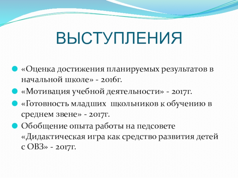 ВЫСТУПЛЕНИЯ«Оценка достижения планируемых результатов в начальной школе» - 2016г.«Мотивация учебной деятельности» - 2017г.«Готовность младших школьников к обучению