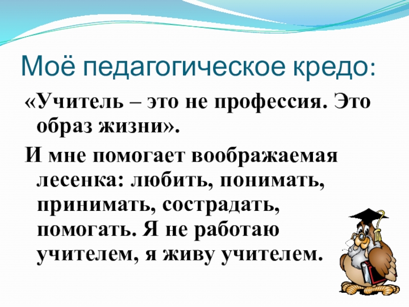 Моё педагогическое кредо:«Учитель – это не профессия. Это образ жизни». И мне помогает воображаемая лесенка: любить, понимать,