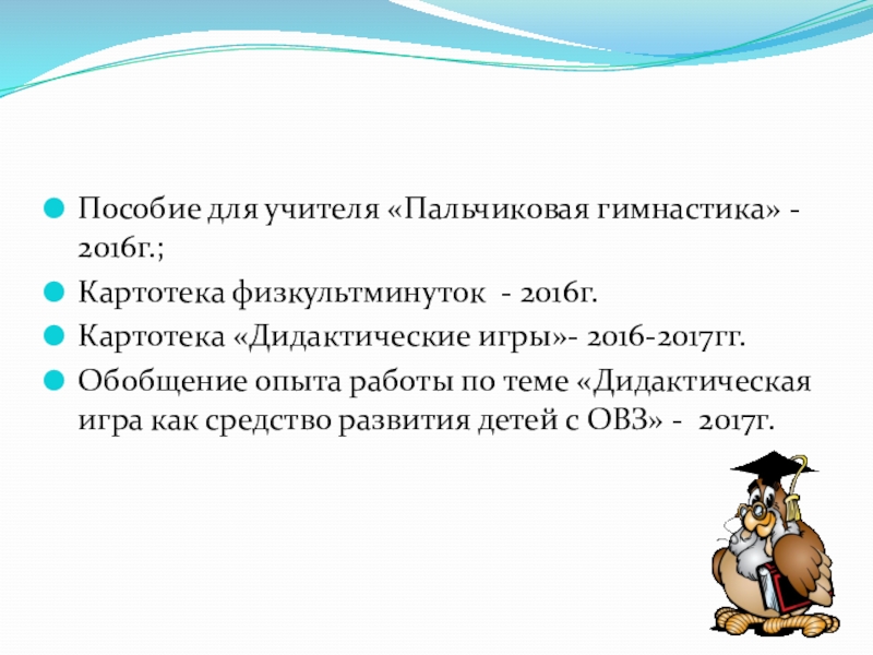 Пособие для учителя «Пальчиковая гимнастика» - 2016г.; Картотека физкультминуток - 2016г.Картотека «Дидактические игры»- 2016-2017гг.Обобщение опыта работы по