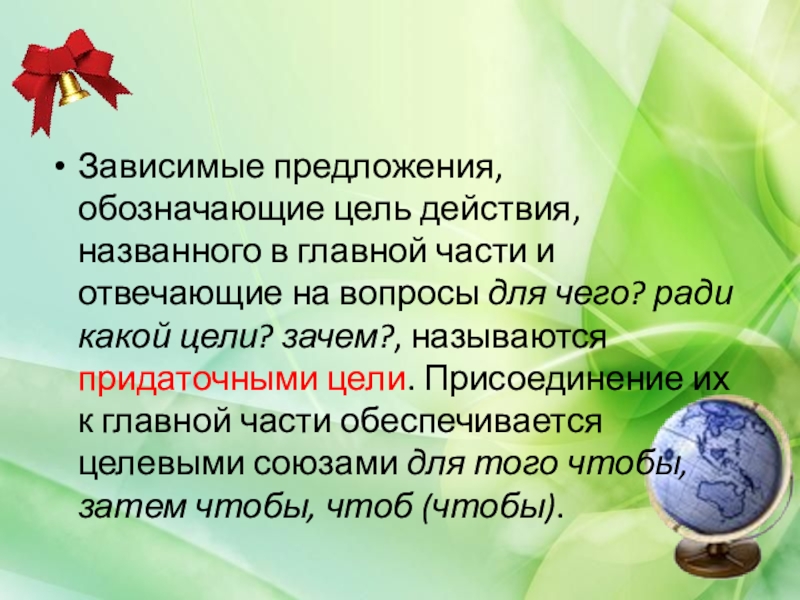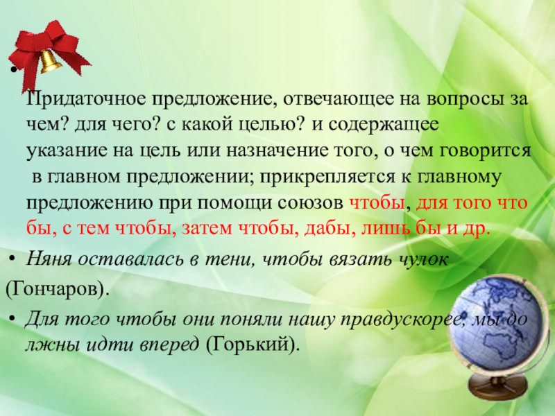 Слайд 7 Придаточное предложение, отвечающее на вопросы зачем? для чего? с какой целью? и содержащее указание на цель или назначение того, о чем говорится в главном предложении; прикрепляется к главному предложению при помощи союзов чтобы, для того чтобы, с тем чтобы, затем чтобы, дабы, лишь бы и др.