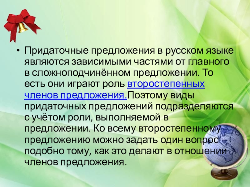сложноподчинённом предложении. То есть они играют роль второстепенных членов предложения.Поэтому виды придаточных предложений подразделяются с учётом роли, выполняемой в предложении. Ко всему второстепенному предложению можно задать один вопрос подобно тому, как это делают в отношении членов предложения.