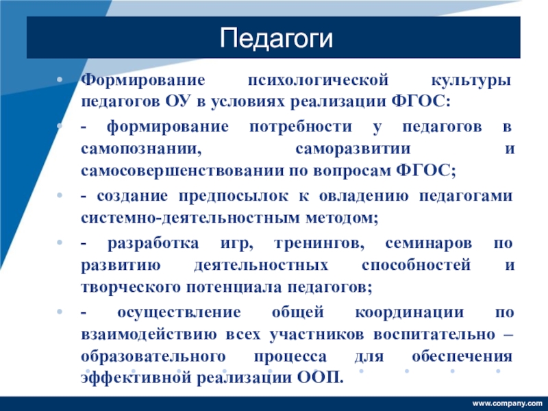 Формирование психологической культуры педагогов ОУ в условиях реализации ФГОС: