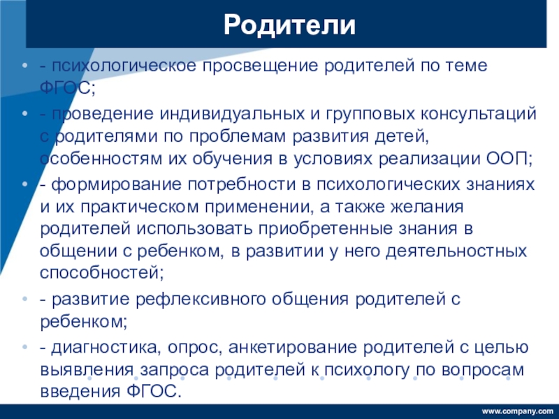 - диагностика, опрос, анкетирование родителей с целью выявления запроса родителей к психологу по вопросам введения ФГОС.