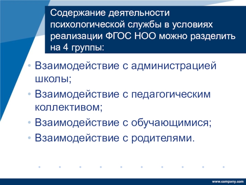 Слайд 5Содержание деятельности психологической службы в условиях реализации ФГОС НОО можно разделить