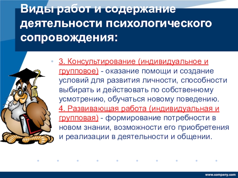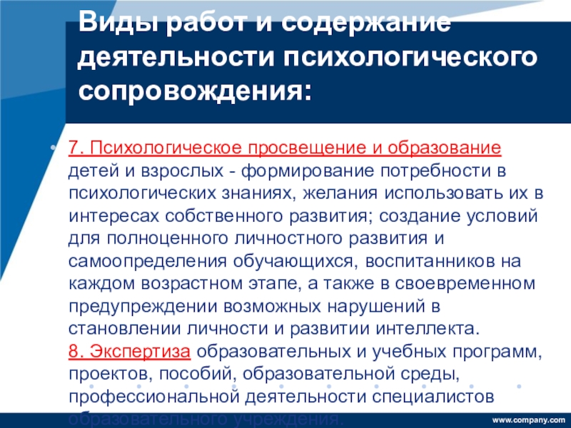 Слайд 7Виды работ и содержание деятельности психологического сопровождения: