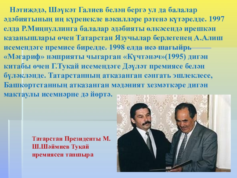 Татарстан Президенты М.Ш.Шәймиев Тукай премиясен тапшыра