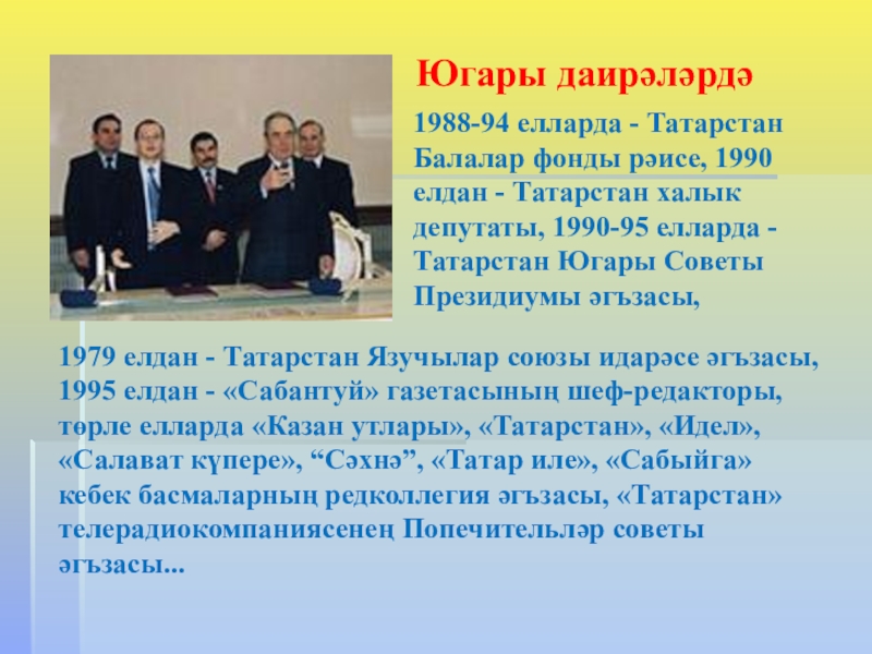 1988-94 елларда - Татарстан Балалар фонды рәисе, 1990 елдан - Татарстан халык депутаты, 1990-95 елларда - Татарстан Югары Советы Президиумы әгъзасы,