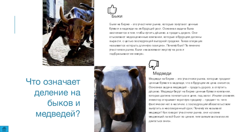 Медведи на бирже – это участники рынка, которые продают ценные бумаги в надежде, что в будущем их цена снизится, Основная задача медведей – продать дорого, а откупить дёшево. Медведи берут на бирже ценные бумаги компании, которая должна понизиться в цене, под залог. Иными словами, инвестор открывает короткую продажу – продает то, чего фактически нет в наличии, с последующим обязательством выкупить в неоговоренный срок. Почему их называют медведи? Как говорят участники рынка, они «словно медвежьей лапой бьют по ценам, тем самым заставляя их двигаться вниз».