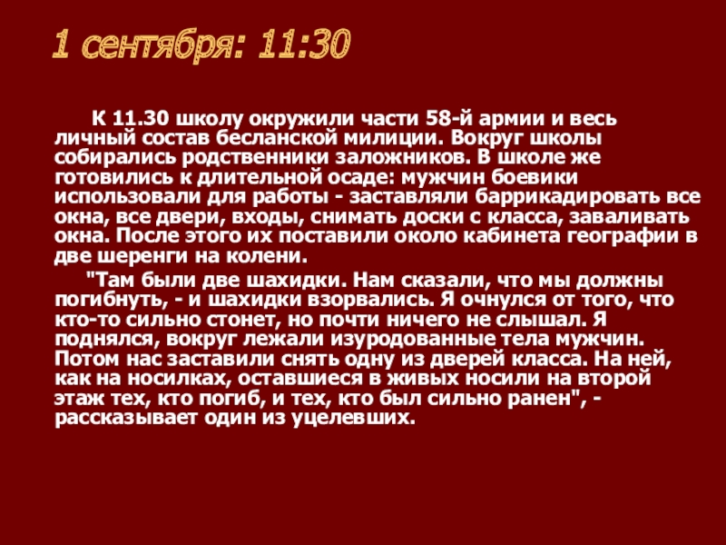 Слайд 6 1 сентября: в 9:08 начался захват школы.