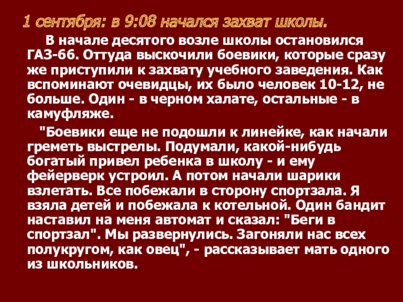 В начале десятого возле школы остановился ГАЗ-66. Оттуда выскочили боевики, которые сразу же приступили к захвату учебного заведения. Как вспоминают очевидцы, их было человек 10-12, не больше. Один - в черном халате, остальные - в камуфляже.