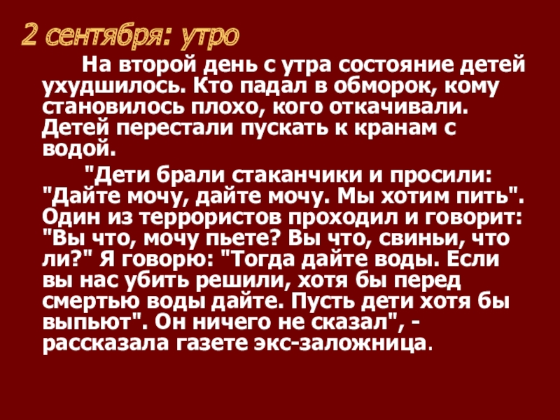 "Дети брали стаканчики и просили: "Дайте мочу, дайте мочу. Мы хотим пить". Один из террористов проходил и говорит: "Вы что, мочу пьете? Вы что, свиньи, что ли?" Я говорю: "Тогда дайте воды. Если вы нас убить решили, хотя бы перед смертью воды дайте. Пусть дети хотя бы выпьют". Он ничего не сказал", - рассказала газете экс-заложница.