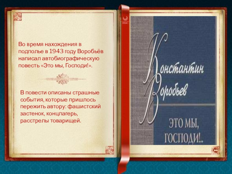 Во время нахождения в подполье в 1943 году Воробьёв написал автобиографическую повесть «Это мы, Господи!».