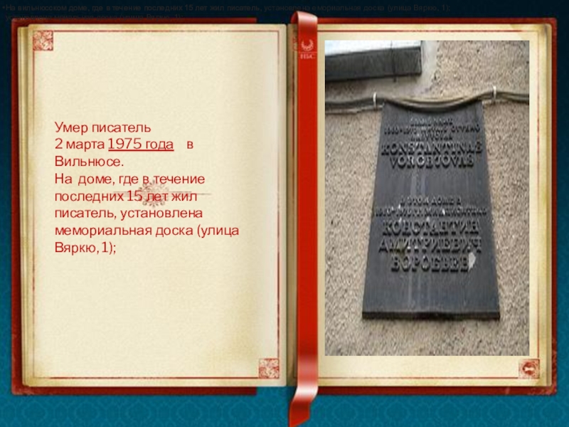 На вильнюсском доме, где в течение последних 15 лет жил писатель, установлена мриальная доска (улица Вяркю, 1);