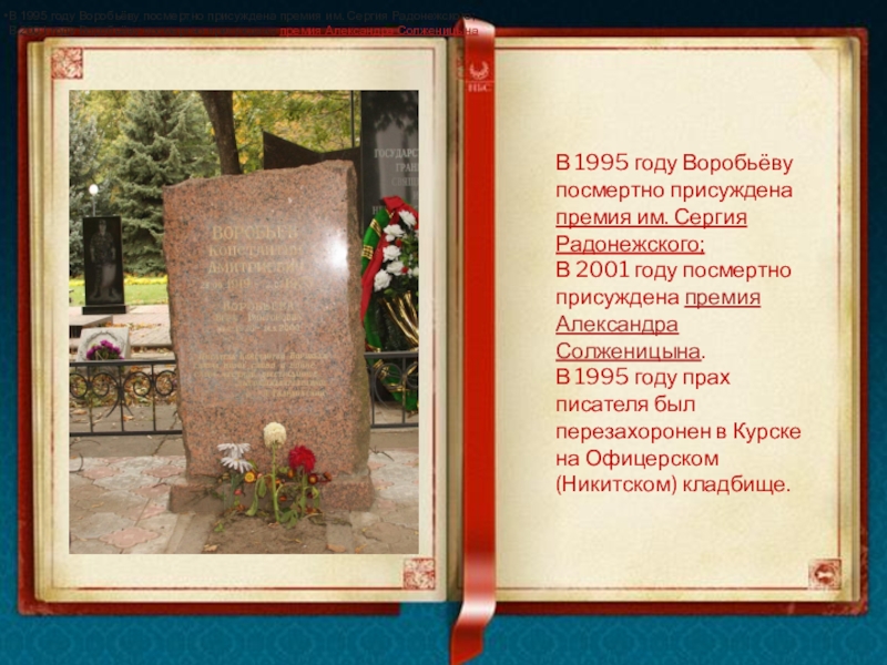 В 1995 году прах писателя был перезахоронен в Курске на Офицерском (Никитском) кладбище.