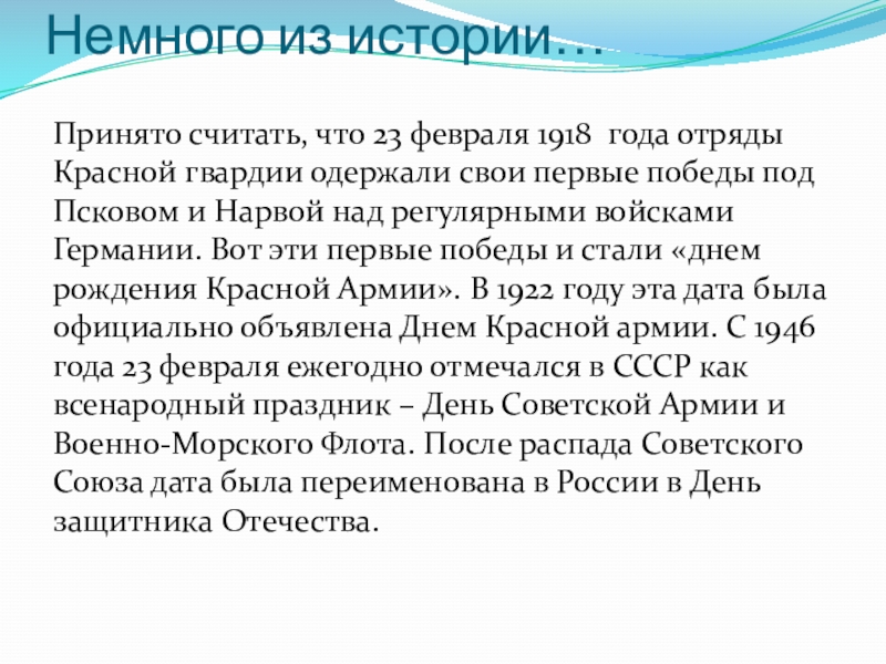 гвардии одержали свои первые победы под Псковом и Нарвой над регулярными войсками Германии. Вот эти первые победы и стали «днем рождения Красной Армии». В 1922 году эта дата была официально объявлена Днем Красной армии. С 1946 года 23 февраля ежегодно отмечался в СССР как всенародный праздник – День Советской Армии и Военно-Морского Флота. После распада Советского Союза дата была переименована в России в День защитника Отечества.