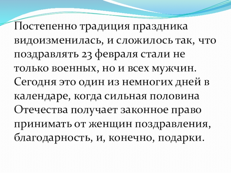 Слайд 6Постепенно традиция праздника видоизменилась, и сложилось так, что поздравлять 23 февраля