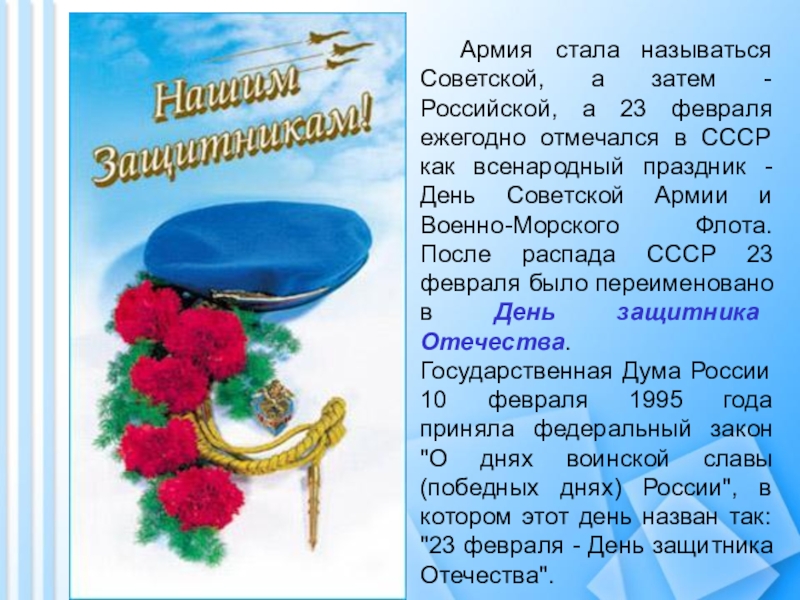 Слайд 7 Армия стала называться Советской, а затем - Российской, а 23 февраля