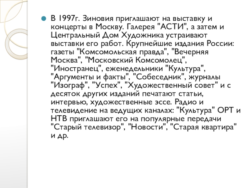 Слайд 9В 1997г. Зиновия приглашают на выставку и концерты в Москву. Галерея