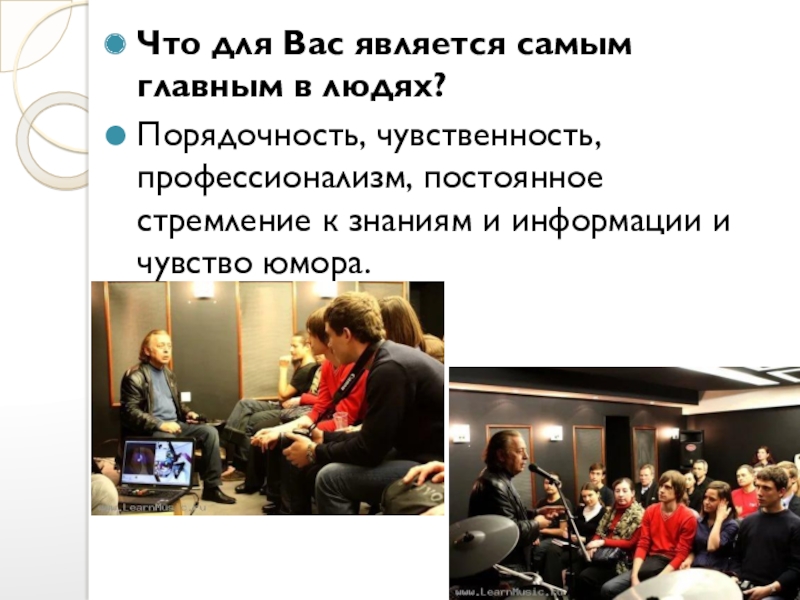 делиться профессиональными знаниями и опытом. На них я стараюсь дать не только профессиональный материал и рекомендации, провожу совместно с ними прослушивание, анализ их произведений, качество записи и рекомендации, но и даю основы успеха в достижении цели, как создавать друзей и коллег, т.е. основы взаимоотношений. Уверен, что это поможет им и в профессии и в жизни.