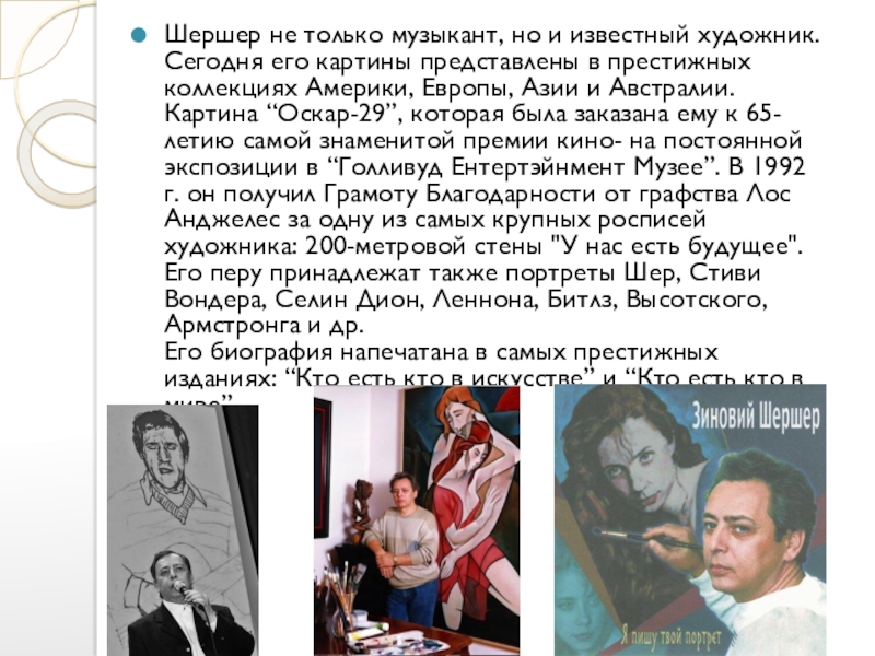 Слайд 10Шeршeр нe только музыкант, но и извeстный художник. Сегодня eго картины