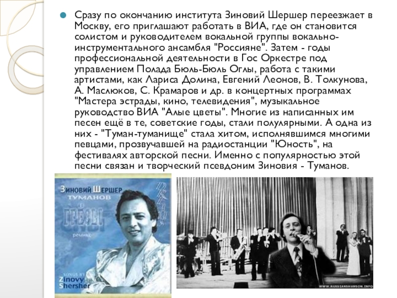 Слайд 5Сразу по окончанию института Зиновий Шершер переезжает в Москву, его приглашают