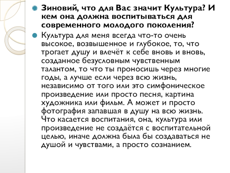 Слайд 12Зиновий, что для Вас значит Культура? И кем она должна воспитываться